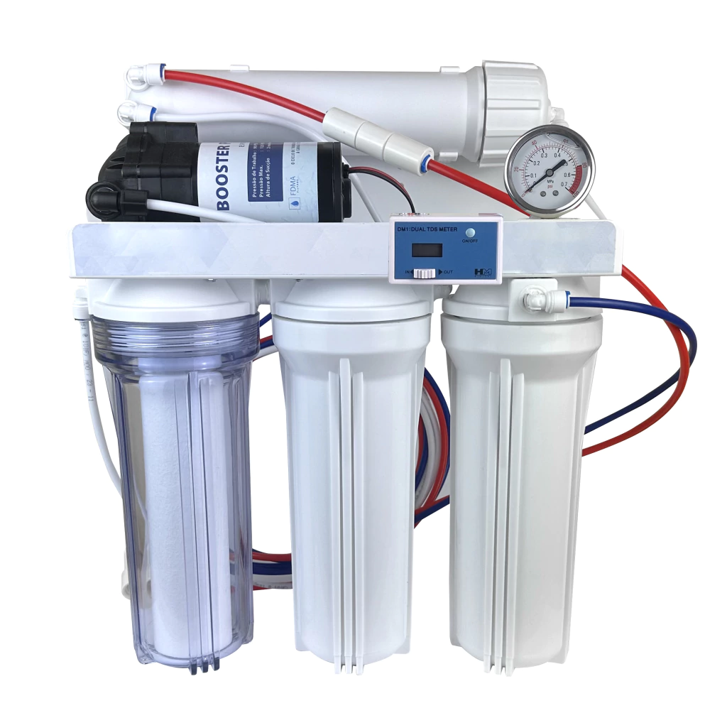 Filtro de Osmose Reversa automatizado 100gpd, produz água zerada para aquários marinhos, farmácias, laboratórios, hospitais, metalização e outros meios que necessitam de água zero minerais. Esse aparelho também é automatizado e com reservatório, ou seja, não é o modelo manual, todo o processo de filtragem é feita de forma automática, quando o reservatório enche o filtro desliga automaticamente. A Osmose Reversa é um processo de separação por alta pressão através de membranas. A água é forçada a passar por membranas com pequenos poros de filtração medem de 0,000001 a 0,0000001 mm com pressões entre 100 e 150psi. As moléculas maiores que os poros são descartados no processo juntamente com uma quantidade de água. Método é cientificamente comprovado para tratamento da água e retirada de agentes poluentes como: vírus e bactérias, cloro, hormônios (provenientes de anticoncepcionais), pesticidas, fungicidas, metais pesados (como o bário, cádmio, cromo, chumbo e mercúrio). Fase 1: - Refil pré filtro de Polipropileno (1 micra - um grão de areia tem entre 200 a 500 micra). - Função: filtragem de componentes físicos, como: ferrugem, lama, sedimentos, etc. Fase 2: - Refil Carvão Block. - Função: retirar completamente mau cheiro, gostos e o cloro da água. Fase 3: - Membrana RO 100GDP (0,0001 micra). - Função: refil com poros microscópicos para purificação, com a capacidade de reter metais pesados, contaminantes químicos, vírus, bactérias, protozoários, algas, sais, fluor e outros. Fase 4: - Refil de Resina mista MB400 Purolite (ânions e cátions). - Função: deionização da água (reduzir a condutividade) Características: - O sistema é pressurizado para garantir a passagem da água pela membrana de osmose reversa. - O sistema é automatizado não é necessário abrir e fechar o registro e nem desligar bombas e outros equipamentos, tudo funciona automaticamente Benefícios: - Aparelho Automatizado com reservatório - Retenção de ferrugem, lama, sedimentos, etc. - Elimina cloro, cheiros, gostos, agentes químicos. - Retém vírus, bactérias, protozoários, metais pesados, contaminantes químicos e outros. Dimensões: - Altura: 46cm - Largura: 20cm - Comprimento: 42cm Dimensões do Reservatório: - Diâmetro: 41cm - Altura: 58cm - Conexão 1/4" Descritivo Técnico: - Fabricante: FDMA Filtros - voltagem: Bomba Bivolt - Reservatório Pressurizado de 40 Litros - Produção de água pura: 16 l/h - Peso do aparelho: 9,800kg Elementos Filtrantes: - Polipropileno 5 micras (um grão de areia tem entre 200 a 500 micra). - Carvão Block 5 micra. - Membrana RO 100GDP (0.0001 micra). - Resina mista MB 400 (ânions e cátions).