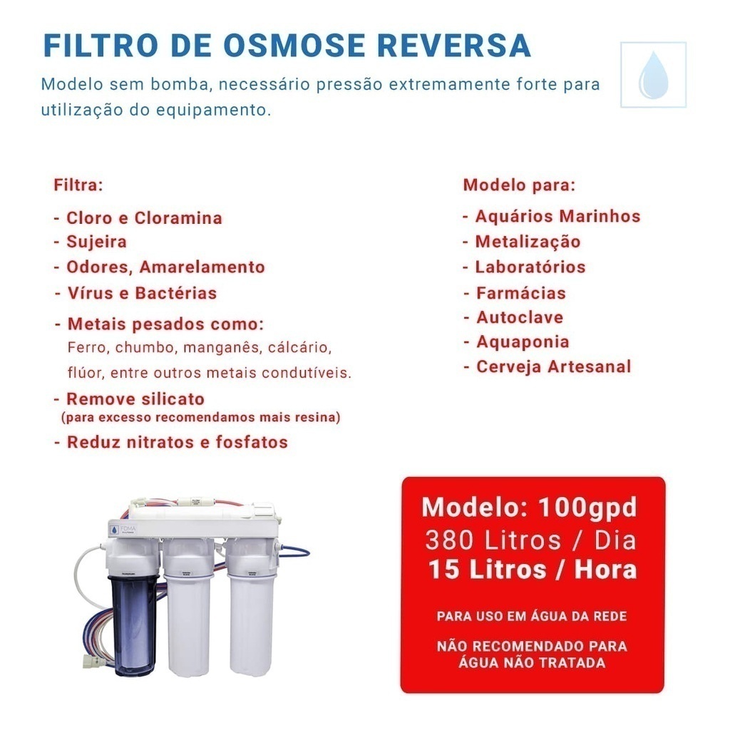 Etapas de filtragem: Fase 1 : Carcaça com refil de fibra de polipropileno 5 micras. Retenção de partículas (barro, areia, argila, ferrugem, insetos). Fase 2 : Filtro 5 micras de carvão ativado para eliminar o cloro, toxinas, equilibrar o PH. Fase 3 : Elemento Membrana de osmose reversa, elimina vírus, bactérias, flúor e outros metais pesados dissolvidos. Fase 4 : Cartucho de resina mista, para eliminar o resto de impurezas da água, e assim a água 100% pura.