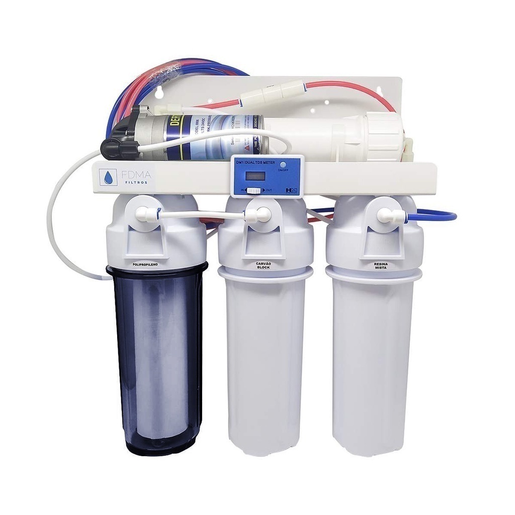 Quando se trata de filtragem de água doméstica, você terá um sistema RO ou RO/DI. Um RO e RO/DI são quase idênticos, exceto que o sistema RO/DI possui um estágio extra de filtragem chamado estágio "DI ou Deionização" que reduz a água a 0 TDS (total de sólidos dissolvidos), ideal para aquários marinhos, plantados ou de camarão.